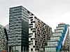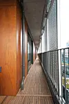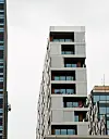 – Den smale tomten har vært medvirkende til utformingen av bredden på bygget. Det måtte være en viss avstand fra boligfasadene til nabofasadene. Ved å utforme den indre fasaden (klimaveggen) i sikksakk fikk vi til bra planløsninger for leilighetene, samtidig som vi fikk til gode balkonger. Det ytre fasadelivet definerer balkongenes ytre avgrensning og har skyve-elementer. De er smale, men fungerer veldig bra, samtidig som leilighetene har balkong i hele lengden. Bygget har balkonger mot nord og sør og sammenhengende balkonger langs østfasaden. Alle med skyve-elementer som gjør at man kan skjerme for innsyn, vind eller sol. Utsikten fra balkongene er mot nord, sør og øst, fordi nabobygget (DNB) trapper seg ned mot sør/øst. Det er fra nord, sør og østsiden man har sol inn og lys. Mot vest tårner Visma-bygget seg, forklarer arkitekt Torkel Njå i MAD Arkitekter.