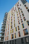 – De flatene kunne fort blitt kjedelige. Vi har forsøkt å lage et spill og et kontrasterende element av disse vinduene, en komposisjon av hull ved å variere vindusplasseringen. Siden dette er hus med bærende betongfasader forblendet med tegl, blir også veggene tykkere. En klar fordel med tanke på støy, varmemagasinering og energiforbruk. De dype vindussmygene har vi valgt å fargesette, slik at det blir spennende opplevelser etter hvert som man beveger seg rundt huset og ser fasadene fra forskjellige vinkler, forklarer Mowé.