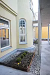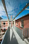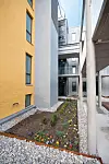 Det store, indre gårdsrommet fungerer som et felles oppholdsareal til avkobling, men også som en plattform til leilighetene som ligger på samme plan og i planet over. Rammen er de gamle fasadene som krones med et omsluttende galleri med glassbaldakin.