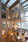 – Den bretter seg inn og er et innsnitt i hele bygget. En dobbel glassfasade er gunstig i en situasjon der bygningskroppen blir liggende rett mot syd, man får kontrollert lysinnslipp og klima til lysgårdsrommet. Glassfasaden er et teknologisk element, som det er viktig å løse på en elegant og funksjonell måte. Begge byggene har også glasstak som kunne sluppet inn mye direkte solvarme, men her har vi utviklet et aluminiumsgrid som ligger over glasstaket. Den nøye tilmålte høyden på gridet, er beregnet ut i fra solvinkelen i Oslo. Dermed får man dagslys hele året, men aldri sollys direkte inn, sier Biørnstad.