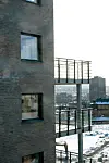 Bortsett fra trekledning på inntrukne balkonger og på enkelte utvalgte steder, har alle fasader tegl av typen Bratsberg Umbro. Sammen med mørk grå gelendere og horisontale spiler med glass på innsiden i balkongene, gir det et raffinert uttrykk.