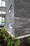 – Det er to siktlinjer inn i Arnebergs Hage. Siden Villa Helle, som ligger godt synlig, har hvit murpuss og stor grå steinbesetning, ønsket vi spille på kontrastene sort og hvitt. Innsiden av gårdsrommet er for det meste mørk tegl av typen Bratsberg Sort Gabbro, som oppleves som rolig og diskret. Framsiden av blokkene er derimot mer lett og lys og er variert for å tilpasse seg småskalaen i den omkringliggende bebyggelsen. Blant annet består brystningsplatene i balkongene av grønne og hvite Steni-plater, med herdet og laminert glass på en av kortsidene, sier arkitekt Lööf.