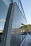 – Nybygget er en forholdsvis enkel konstruksjon bestående av stål og hulldekker, sier prosjektleder Thomas Giessler i Bermingrud Entreprenør til Byggeindustrien. Fasadene består av Paroc-elementer og glass. Det mest visuelle aspektet med bygget er flere perforerte og lakkerte aluminiumsplater som deler opp glassfasaden ved inngangspartiet. Stålplatene er lyssatt, slik at effekten blir ekstra stor på kveldstid. Oppvarming i verksteddelen skjer med gass-stråler i taket som blir forsynt med naturgass fra Skagerak Energi. Ustillingshaller og kontorer skjer med varmepumper og ventilasjonsanlegg med utestående aggregat på taket. Giessler beskriver dette som kjente løsninger.