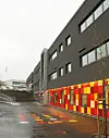 – De øverste etasjene er nøytralt utformet med en mørk grå pussfasade der vinduene ligger dypt inntrukket som bånd i fasaden. Nedre etasje har kledning av kvadratiske fasadeplater. Platene er i høyglans i flere farger blandet «tilfeldig», men der hovedfargene på undervisnings-fløya følger fargesirkelen med grønt mot øst, gult mot sør, rødt mot vest og blått mot nord, sier Lerkelund.