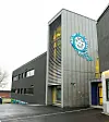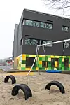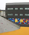 Byggeindustrien besøkte prosjektet på en grå novemberdag, men skolen fremsto allikevel innbydende og fargerik. Arkitekt og landskapsarkitekt har nemlig også fått boltre seg. Et av flere spennende elementer er at nederste etasje i fasaden er kledd med Steni Colour-høyglans i forskjellige farger.