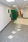 – På fasadene er det benyttet luftet puss-system, som innebærer utlekting med metallprofiler kledd med sementbaserte fasadeplater og oppbygging av Webers pussystem med farget sluttpuss, forteller Nordseter. Et annet litt uvanlig fargeinnslag er farget glassbyggerstein som er skåret inn i fasadesystemet. Utvendig solavskjerming på vinduer består av motoriserte persienner integrert i det utlektede fasadesystemet, mens glassfasadene i trapperommene har fast solavskjerming.
