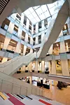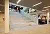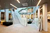 Det naturlige midtpunktet i Egmontbygget er atriet som går over alle seks etasjene. Og synliggjør det samlingselementet det er å bruke trappekjernen som en identifisering av Egmonts virksomhet. – Atriet bidrar med dagslys, og har vertikale kommunikasjonsveier i form av trapper som også går diagonalt mellom etasjene. Fellesfunksjonene, med lounger, tekjøkken og sosiale soner, ligger i tilknytning til atriet. Tekjøkken i hver etasje er sorte elementer som står som kontraster mellom det lyse atriet og de lyse fasadene, sier Elverum. Interiøret er blitt til i fellesskap mellom MAD og interiørarkitekten Metropolis arkitektur & design, som er direkte kontrahert av Egmont.