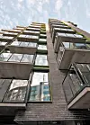 På en liten tomt på Holmen på Tjuvholmen klarer et nytt leilighetsbygg kalt Hus 84 å skille seg ut med en sort teglfasade i spedd grønne og oransje fasadeplater.