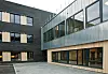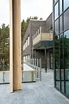 – Det er valgt en fargepalett som står seg godt til skogåsen Trompeten. Det ble valgt en mørk tegl i fløyene, zink i midtbygget og med store accoyafelter. Materialvalget inne er også av god kvalitet som gir en god følelse, sier arkitekt Skarpaas. I motsetning til ungdomsskolen som lå her, er den nye bygningsmassen trukket lenger sør, noe som har gitt de to sansehagene i nord og den nye grendelekeplassen en plassering på en tilnærmet flat og solrik tomt.