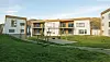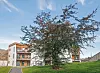 Et stort bøketre er tatt vare på og blitt en viktig del av grønt-arealet, og med en motorvei passerende på nordsiden ligger derfor mange av soverommene inn mot grøntarealet på sørsiden.