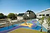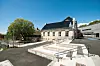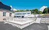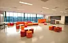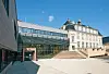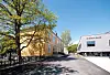 Nybygget kobler seg på hovedbygget via et trekantformet sentralrom og en vestibyle med en stor glassfasade. Sitteamfiet går «gjennom» vinduene og fortsetter ute som en del av ute-