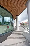 Fasadene har påhengte fasadeelementer i lys, slipt betong. Inne i inngangspartiet finner vi dem også, her med sort tilslag i betong-blandingen. De er produsert på Kynningsruds egen betong-elementfabrikk på Kasen utenfor Uddevalla.