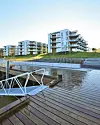 De første beboerne i Kanalen kunne flytte inn allerede i sommer. Så langt har tre av de seks husene i den maritime boligrekken kommet opp, og et påkostet uteområde med stor lekeplass er ferdigstilt i forbindelse med prosjektet. Langs kanalen, som prosjektet har fått navnet sitt fra, har beboerne en flott promenade med sittegrupper, hengekøyer og småbåthavn kun noen meter fra ytterdøren.