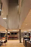 sjonen i massivtre, som de opprinnelig hadde tegnet, ble erstattet med betongsøyler og dragere. Han mener tre hadde gitt et finere interiørmessig uttrykk.