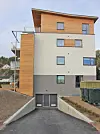 Fasadeveggene er utført med pussede betongelementer, 350 mm Leca isloblokk. Utvendig kledning er en kombinasjon av farget betong i to farger og varmebehandlet furu trepanel. På toppen er det en klimavegg med trestendere og isolert med Glava.