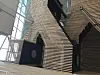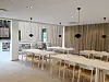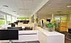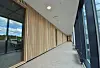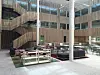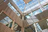 Bygget har fått et stort, åpent atrium med glasstak og trespiler på veggene, og i kjelleren kan brukerne benytte seg av et stort og velutstyrt treningsstudio.