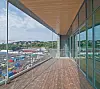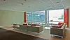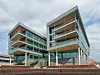 Glassfasader mot sjøen og kontorfronter i glass gir et lyst og luftig inntrykk.