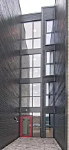 Fasadene har svart trekledning som først er beiset på fabrikk og så på byggeplassen. I leilighetene er det eikeparkett på gulv i stue, kjøkken og soverom og flis på bad.
