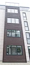 I gavlvegger er det stålsøyler og betongdragere. Takene består av q-dekker som er isolert og tekket. Fasadene er kledd med hvite cembrit-plater og felt med mørkebrunt trepanel. Trappehusene har belegg i gulv og trinn.