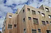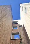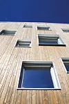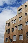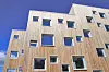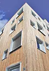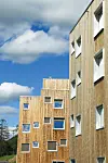 elementer med en høyde på opp til 12 meter på råbygget. Veggelementene ble levert ferdige utvendig med vinduer, beslag og kledd med en ytterkledning av varmebehandlet og vedlikeholdsfri Kebony. Studentboligene er bygget som passivhus.