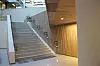 – Derfor måtte vi benytte lyse farger som reflekterer lys og mest mulig glass på de nye delene av tiltaket. Ved å benytte hvit og lys gråfarge på overflatene oppnådde vi å kontrastere det eksisterende uten å konkurrere med det. Flisene i kontorinn-gangen er en lys Quartzkompositt i store formater. Den glimrer og føles delikat. mener Torgersen og tilføyer at trespiler er brukt som dekorelement på enkelte vegger og i himling foran heiser.