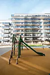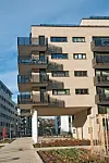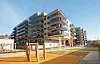veien i øst. Platået er hevet ytterligere ved å legge p-anlegget med to etasjer, og med innkjøring fra sørvest, under to av de tre blokkene. De er på totalt åtte etasjer, men varierer noe i størrelse med henholdsvis 61, 103 og 89 leiligheter i de tre blokkene.