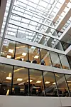 – Opprinnelig var det prosjektert med gangbroer rundt hele atriet, men det ga veldig dårlig arealeffektivitet. Glassveggene i atriet ble derfor trukket inn på tre sider inn på dekkekanten, slik at det ble mindre korridorarealer og mer plass til kontorarealer.
