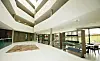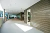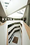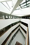 Innenfor hovedinngangen i første etasje ligger et åpent atrium over resepsjon, vestibyle og kantine.