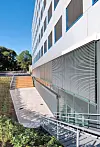 hetene holder til i lamellene. Mot skolearealene ligger auditoriet og flerbrukshallen som går over tre etasjer. Over store deler av hallen, auditoriet og de tekniske rommene, er det bygget en skolegård.