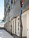 Balkongfasadene i metall har et selvbærende rammesystem, der de bakenforliggende konstruksjonene er festet i dekkekonstruksjonene. Balkongplasseringene varierer og er tilpasset leilighetene bak, uten en umiddelbar gjenkjennbar gjentakende eller repeterende effekt.