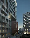 – At det skulle på plass såpass høye bygninger, gjorde det påkrevet å intimisere fasaden – å gi bygget et filter i forhold til omverdenen. Det skal ikke oppleves å være en begrensning i forhold til lys og luft. I fasadene har Tårn A og Tårn B et ytre «nett» av metall som er åpent sett forfra, men som blir lukket sett sideveis. Det var viktig for oss å få til dette sløret, det gir en tydeliggjøring av hovedformen. Det er balkongfasadene som beskriver bygningsvolumet på tomtestripene, fordi de skal i henhold til reguleringen fylle tomtestripene helt ut. Innenfor et relativt strengt bygningsvolum mener vi at vi med disse dobbeltfasadene har oppnådd å gi en overraskende variasjon og med sprang i proporsjonene, sier Suul.