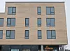 Næringsdelen har forblending av en mørk teglstein, lavere og bredere enn tradisjonell teglstein. Boligdelene er kledd med plater av akoya, et hurtigvoksende furutre fra New Zeeland. Treverket er kokt i eddik og vil få en grå patina etter et par år. Kledningen skal stå i minst 50 år uten å råtne.