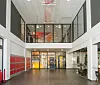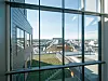 kledning (alutile antrasink sinusplater) og felt med røde Cembrit-plater. Bygget har glassfasader mot alle retninger.