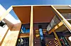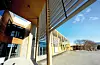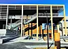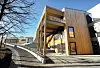 Hovedinngangen er sørvendt, med stor glassflate. Inngangsfasaden er preget av en kraftig, men samtidig luftig, utvendig «screen» av horisontalt skråstilte trespiler som skal fange opp solen den delen av året den står høyest.