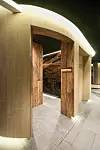 – Det var viktig for oss å vise at snittet formidler en lesbarhet om at vi er i terrenget. De mørke og lune badstufunksjonene er lagt inn i bakken der buede vegger forteller at vi er under terrenget. Når du beveger deg opp-over kommer du til de japanske badstuene som er vendt mot dagslyset, og til uteanlegget med bassenget som ligger øverst. Vi vil at huset skal vise kundene at de beveger seg fra parkeringsnivået og opp gjennom huset til de er oppe i skogen for å kunne nyte uteanlegget. Derfor går hovedbassengområdet over tre etasjer, og som man beveger seg rundt, forteller Øystein Rognebakke.