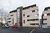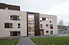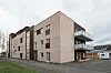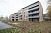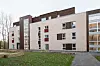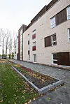 Det er fire innganger, og for å signalisere disse er heis- og trappetårnene gitt et vertikalt preg ved hjelp av stående trepanel.