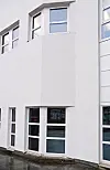 Bygget er vinklet og tilpasset gateløp og reguleringsplan. Bygget har mange skråtak med båndtekking, som er ettersett og reparert der det var behov form det. Den flate delen av taket sentralt på bygget er skiftet og består av q-dekker som er isolert og tekket med takbelegg. Utskiftning skjedde seksjon for seksjon. Betongfasaden er pusset og malt. Alle vinduer er nye og har en U-verdi på 0,6.