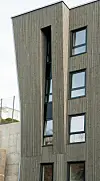 – På en relativ smal tomt med store terrengforskjeller har vi ved å modellere bygget med skrå yttervegger fått til et romslig og positivt utfordrende romforløp. De tre byggene fremstår som ett bygg med moderne formspråk og særpreg. Dette er bygg som er inspirert fra tradisjonelle sjøhus langs kysten, og gir en god tilpassing til beliggenheten på kaikanten. Byggene har tre-