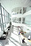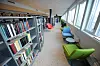 Hoveddelen av byggets første etasje inneholder biblioteket. Biblioteket markerer seg gjennom sitt nordvendte amfi og gjennom den sirkulære plassdannelsen foran hovedinngangen. Hovedinngangen synliggjøres ved at den fire meter høye glassfasaden bukter seg inn og danner en del av sirkelbuen i forplassen.