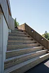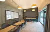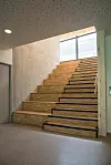 – En nordisk hardvoksbehandlet industriparkett av eik og lys ospepanel i taket tilfører taktilitet og varme. Vegger og rekkverk omkring trappen er kledd med osp, ellers enkle malte flater. Også amfitrappen som forbinder etasjene samt kiosk/resepsjonsdisk er «varme» elementer kledd i osp, fortsetter Tryti.