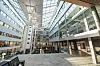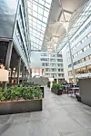 – Derfor har alle de fire innvendige veggene forskjellige fasader. Høyblokka har aluminiumfasader innenfor glasstaket, mens det er lagt nye glasskledning i fasaden over glasstaket. Det eldste bygget har pussflater, mens bygget i vest har samme eikespilekledning som finnes i resepsjonen og i himlingen i baldakinen utenfor. Nå er det en miks av tegl, eikespiler, aluminiumkledning og perforerte gipsplater i de innvendige fasadene, sier Kløvvik.