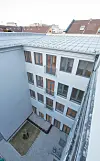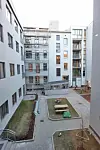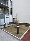 Det er opparbeidet et privat gårdsrom som er felles for alle tre byggene, med plener, busker, stein- og gummiheller, sittegrupper, sykkelparkering og lekeapparater.