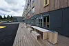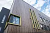 Hovedfasaden har stående Kebony som kledning, i kombinasjon med platekledning på øvrige fasader og i deler av sokkelen, som sammen med plassering av vinduer med gul identitetsskapende innramming i et systematisk mønster bidrar til letthet og til å skalere ned høyden. Kebony-panelene er nå relativt mørke, men vil over tid få den kjente sølvgrå patinaen.