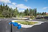 Et påkostet utomhusområde inneholder utetribuner, plattinger, sandvolley- og håndballbaner, løpebaner og knallgule skatetuer. Anlegget glir inn i miljøet med eksisterende og tilliggende tennisbaner, gangveier og en liten alpinbakke med heis.