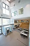Fra hovedinngangen, som har en sentral plassering i fasadene, kommer man inn i allrommet som går over to – delvis tre – etasjer, og der nivåforskjellen formidles via et amfi som knytter plan 1 og 2 sammen. I umiddelbar nærhet ligger administrasjon, elevtjenesten, personavdeling, kantine, bibliotek og auditorium. Fellesrom og spesialrom som skal brukes av alle er lagt mest mulig sentralt på plan 1, og hjemmeområdene for de uliketrinnene på plan 2 og 3 har en nær tilknytning inn mot dette området.