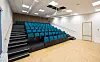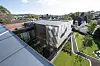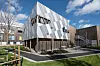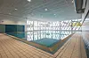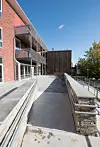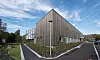 I de nye ytre volumene som HENT har etablert er det både et auditorium i vest og et terapibad mot sørøst. En skjermvegg av tre og tre ulike typer plexiglass i et diagonalt mønster danner en skjerm foran terapibadets vinduer mot den lille parken og mot naboene. – Vi ville ha så mye dagslys som mulig inn i terapibadet. Men innså det ville innebære et problem ved å eksponere brukerne der. Skjermen ivaretar avskjerming i forhold til sol og innsyn. Noen åpne felt i skjermveggen gjør allikevel at man noen steder kan se ut gjennom skjermen, mens det andre steder er diffust utsyn, forklarer Aksnes.