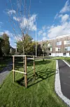 – Vi ønsket å gi de nye tilbyggene et annet fasadeuttrykk enn det gamle sykehusets teglfasader, det skulle være mulig å skille mellom nytt og gammelt. Vi ville ikke prøve å finne en tegl som skulle matche de gamle fasadene, men gi de nye fasadene et nytt og moderne uttrykk. Som fasademateriale i de nye tilbyggene er det valgt jernvitrolbehandlet lerk. Men der det er lagt ny bygningsmasse utenpå fasadene, valgte vi å la den gamle teglen være synlig enkelte steder inne i korridorene, sier Aksnes.
