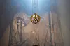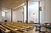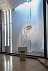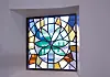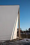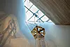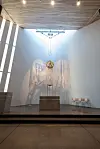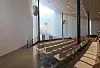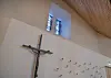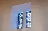– Men det var krevende å videreføre noe av ånden i det gamle. Det ble tatt vare på alterdekorasjonen, et krusifiks og to glassmalerier, som nå har fått en plassering på veggen mot vest. Alterveggen i øst er et hjørne som vi kappet skrått. I trekanten kommer nesten alt av lys inn ovenfra. Øvrig dagslys er bare smale, vertikale spalter. Den skrå alterveggen er også synlig utenfra der den holdes opp med en limtresøyle, forklarer Wiig.