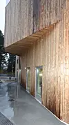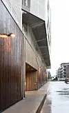 Diplomingeniør Susanne Puchberger i 3RW arkitekter forteller at byggets fasader er holdt i lyse farger og trekledning.