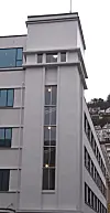 Første etasje er rektangulær. Fra andre etasje og opp har bygget tre fløyer akterover fra fasaden langs Zander Kaaes gate, en fløy langs Lungegårdsbakken og to fløyer inn i bakgården. Et trappetårn på fem etasjer i byggets sydlige hjørne er bevart og påbygget en etasje. Langs Kong Oscars gate er den verneverdige fasaden pusset opp og malt i opprinnelige beige farger.